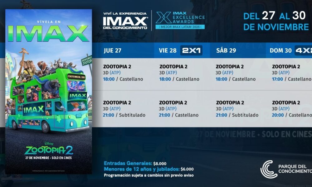 Esta semana llega la secuela de la aclamada película de 2016. Judy Hopps, la coneja policía novata e idealista, vuelve a unir fuerzas con Nick Wilde, el zorro más astuto de la ciudad. El film redobla la apuesta con humor, ironía urbana, guiños para adultos, mensajes atentos para los más jóvenes y una fauna ampliada que promete nuevas situaciones. Entradas en parquedelconocimiento.com (promociones viernes 2×1 y domingo 4×2).