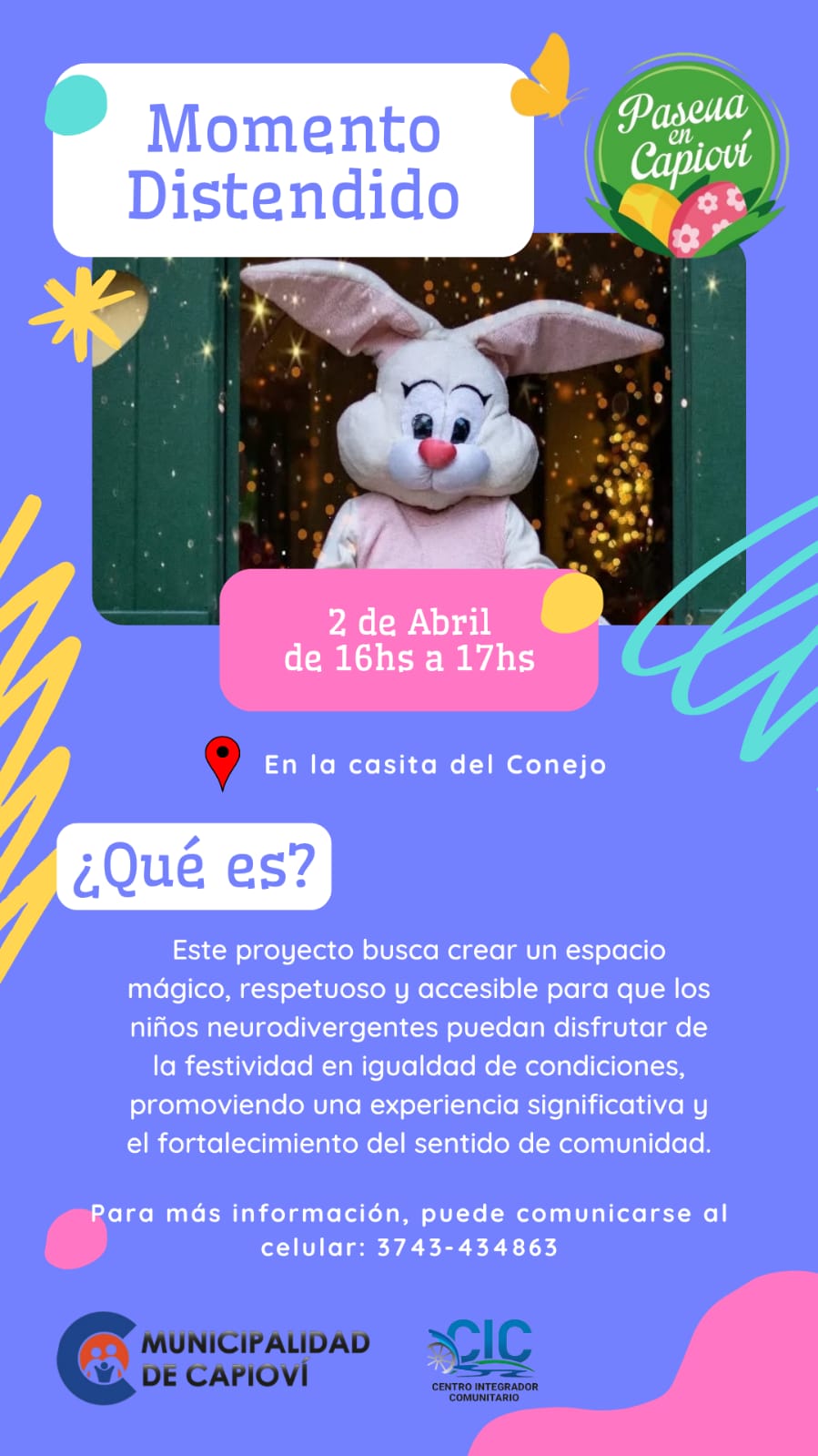 El municipio de Capioví tiene presente a todos en las actividades de Pascua, por ello pensó en personas con alguna necesidad especial y creó el “El «Momento Distendido» de Pascua, una actividad especial diseñada para niños con neurodivergencias (como TEA o TDAH), que ofrece un espacio sin ruidos fuertes ni luces intensas durante las celebraciones. Se realiza en fechas específicas, como el Jueves Santo (16:00 a 17:00), permitiendo disfrutar la decoración sin estimulación sensorial excesiva.