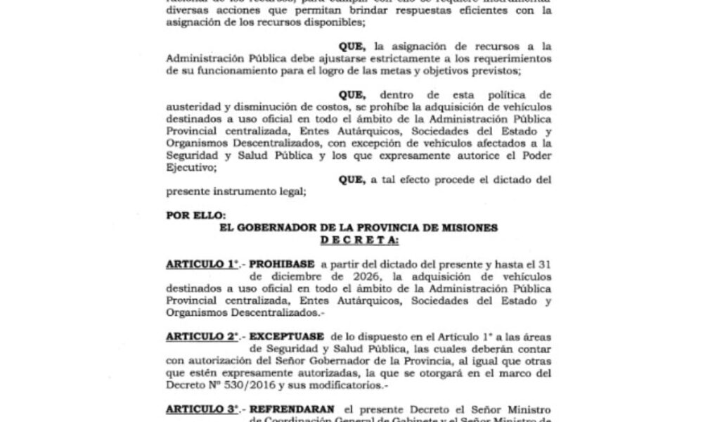 A través del Decreto N.º 375/2026, el gobernador de Misiones, Hugo Passalacqua, dispuso la prohibición de compra de vehículos para la administración pública provincial centralizada, entes autárquicos, sociedades del Estado y organismos descentralizados. La medida rige desde la fecha de su firma y se extenderá hasta el 31 de diciembre de 2026.