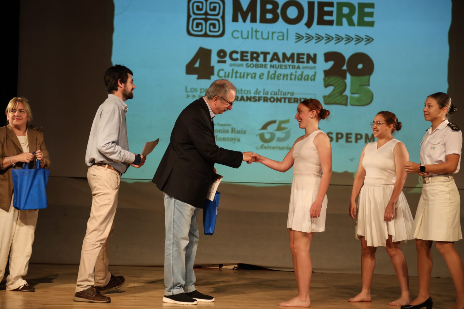 El gobernador Hugo Passalacqua participó este jueves de la ceremonia de premiación del 4° Certamen Mbojere Cultural 2025, que tuvo lugar en el Salón Auditórium del Instituto Superior Antonio Ruiz de Montoya (ISARM). En el evento, estudiantes de distintos puntos de Misiones y de Santa Catarina (Brasil) compartieron sus producciones finales, en una jornada que conjugó arte, reflexión y diálogo intercultural.