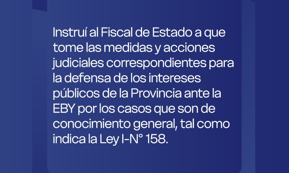 POSADAS. MARTES 21 DE OCTUBRE DE 2025. El gobernador Hugo Passalacqua comunicó en sus cuentas oficiales que instruyó al Fiscal de Estado a que adopte «las medidas y acciones judiciales correspondientes para la defensa de los intereses públicos de la Provincia ante la EBY por los casos que son de conocimiento general, tal como indica la Ley I-N° 158».
