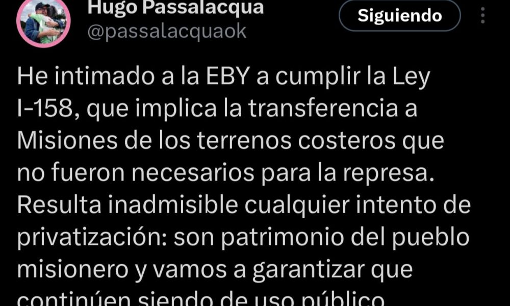 El gobernador de Misiones, Hugo Passalacqua, intimó formalmente a la Entidad Binacional Yacyretá (EBY) a que transfiera a la Provincia los terrenos costeros que no fueron necesarios para la ejecución de la represa, en cumplimiento de la Ley I-158. La decisión apunta a resguardar estos espacios como patrimonio público y de identidad colectiva de los misioneros.