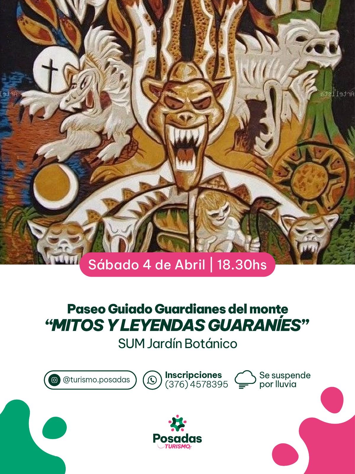 El viernes 3 de abril, a las 18:00 hs, se celebrarán los tradicionales “Viernes culturales”, con una feria de artesanos y emprendedores, así como actividades recreativas y artísticas para toda la familia. Por su parte, el sábado 4 de abril, de 8:30 a 12:00 hs, se realizará un “Paseo guiado por el casco céntrico”, partiendo desde la Plaza 9 de Julio. Más tarde, a las 18:30 hs, se desarrollará el paseo “Guardianes del Monte: Mitos y Leyendas Guaraníes” en el Jardín Botánico, una experiencia que pone en valor el patrimonio de la identidad misionera con relatos de la selva y personajes mitológicos locales. También, a las 18:30 h, seguirá el programa cultural “Posadas amiga de las infancias” con la temática “La ciencia es un juego” en el Parque de las Fiestas.