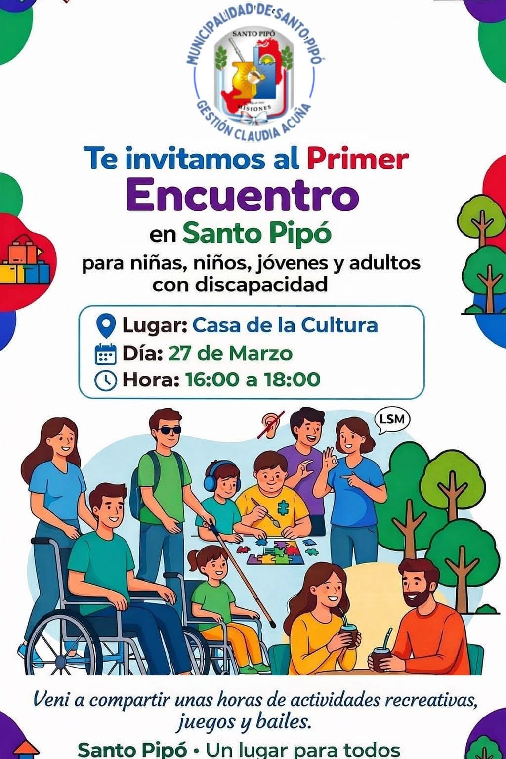Por lo dicho, la gestión de Claudia Acuña al frente de Santo Pipó invita a niñas, niños, jóvenes y adultos con alguna capacidad diferente a participar del «Primer Encuentro de Inclusión», un espacio pensado para compartir, integrarlos y disfrutar juntos.