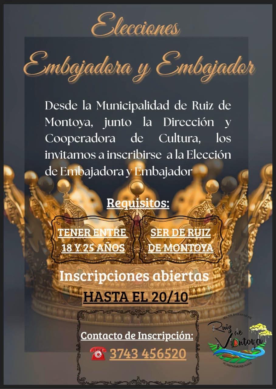 Junto a la dirección y cooperadora de cultura local, el intendente Víctor Vogel tiene el agrado de invitar a la elección de la “Embajadora y el Embajador 2025 de Ruiz de Montoya”, en una noche que estará colmada de desfiles, presentaciones y actuaciones que capturaran la esencia de la cultura e idiosincrasia del pueblo.
