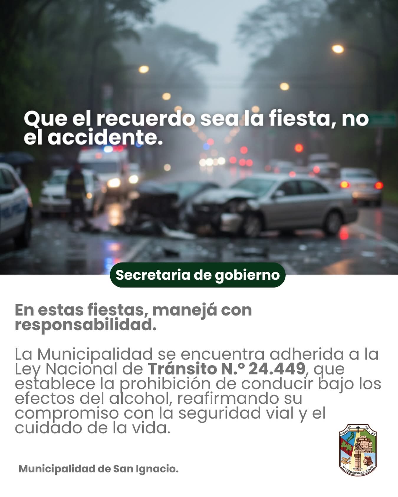 Recuerdan además que la municipalidad se encuentra adherida a la Ley Nacional de Tránsito N.º 24.449, que establece la prohibición de conducir bajo los efectos del alcohol, reafirmando su compromiso con la seguridad vial y el cuidado de la vida.