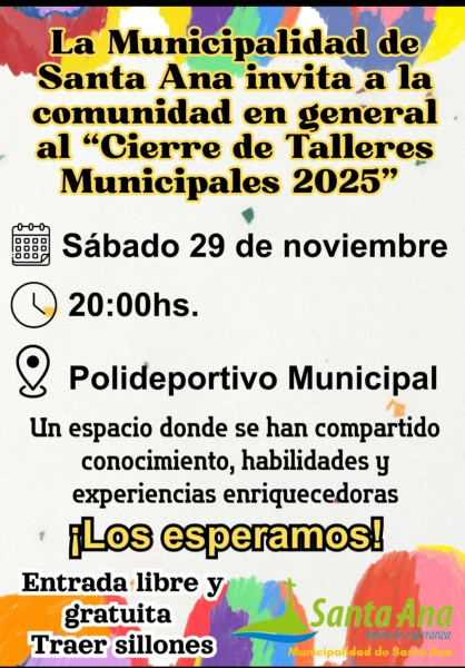 La Municipalidad de Santa Ana, y la gestión de Mabel Pezoa,invita a toda la comunidad a acompañar la presentación de los trabajos realizados durante el año en los distintos talleres municipales.