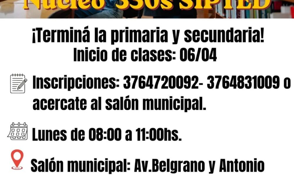 Así mismo quienes quieran culminar sus estudios primarios o secundarios podrán acudir al núcleo 350S del Siptep, acercándose al salón municipal en avenida Belgrano y Antonio Melo, de lunes a viernes de 8 a 11 hs o bien comunicarse a los teléfonos 3764-720092 o 3764 -831009.
