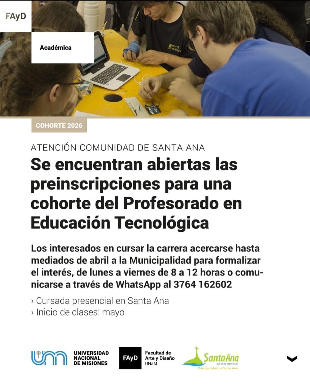 Además desde el municipio informan que se encuentran abiertas las preinscripciones para la cohorte del profesorado de educación tecnológica. Quiénes desean cursar la carrera deberán acercarse al edificio municipal a partir del 15 de abril a formalizar el interés de lunes a viernes de 8 a 13 hs, o bien comunicarse vía WhatsApp al 3 7 6 4- 16 26 0 2.