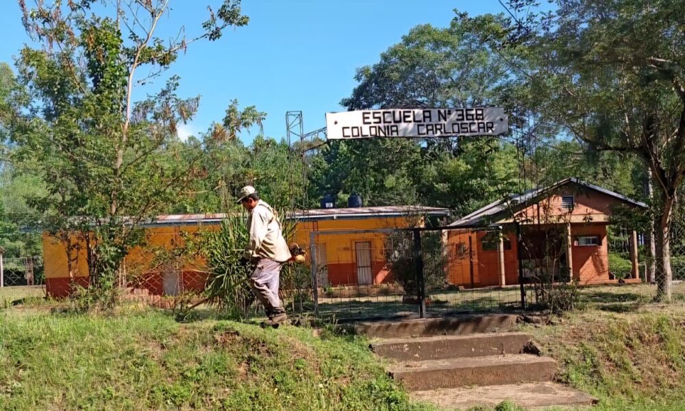En la colonia Carloscar, a unos quince kilómetros del casco urbano, los equipos realizaron desmalezamiento y acondicionamiento en inmediaciones de la Escuela 368, asegurando un entorno seguro para el lunes 2 de marzo.