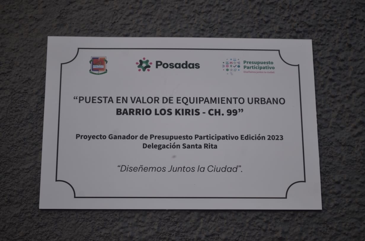 El acto de inauguración se centró en la firma del acta de entrega de la obra, correspondiente al proyecto ganador del Presupuesto Participativo 2023, denominado “Puesta en Valor de Equipamiento Urbano – Barrio Los Kiris – Chacra 99”, gestionado por la Delegación Municipal Santa Rita. La plaza se encuentra ubicada estratégicamente entre las calles 105, 100 y 103.