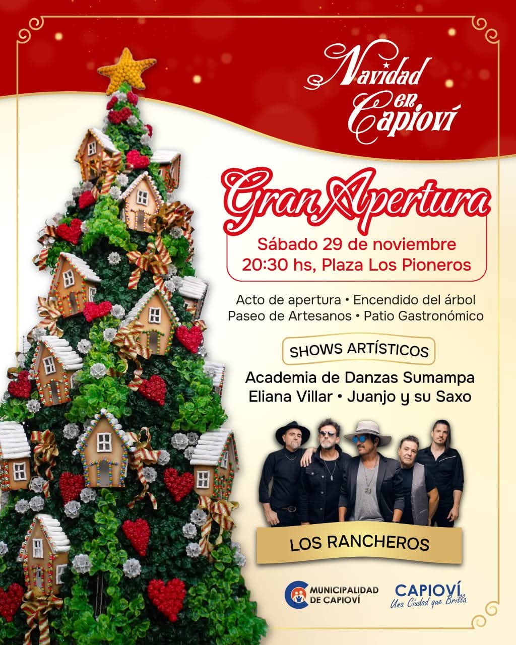 Esta edición, “Navidad en Capioví”, tendrá un condimento especial en el mismo comienzo, el día 29 de noviembre, a las 20,30 hs en la plaza Los Pioneros, con la presentación en vivo de una de las bandas de mayor trayectoria a nivel nacional “Los Rancheros”.
