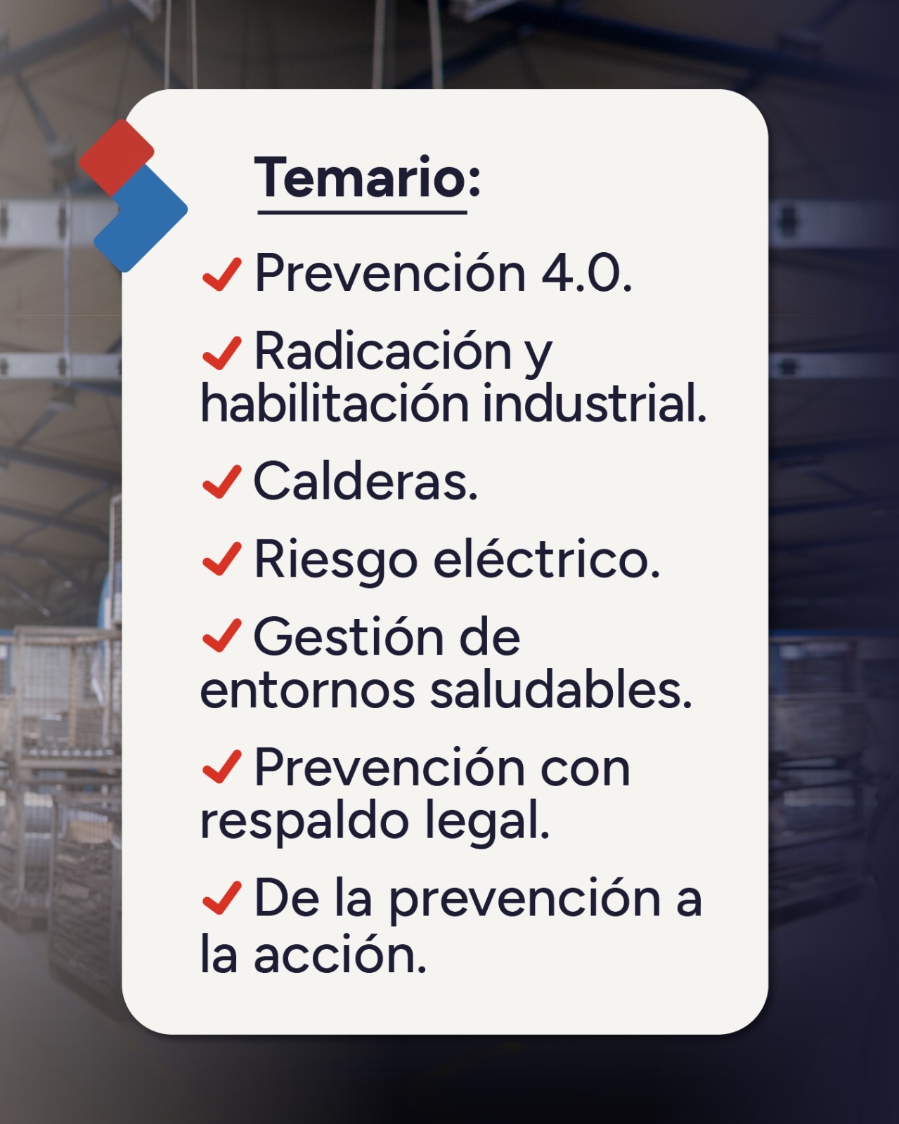 Se desarrollarán exposiciones sobre radicación y habilitación industrial, prevención en calderas, riesgo eléctrico en entornos laborales, y la gestión de entornos saludables, incluyendo mediciones de ruido y calidad del aire en espacios de trabajo.
