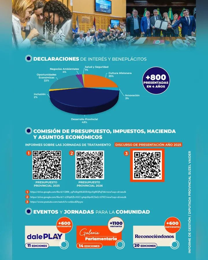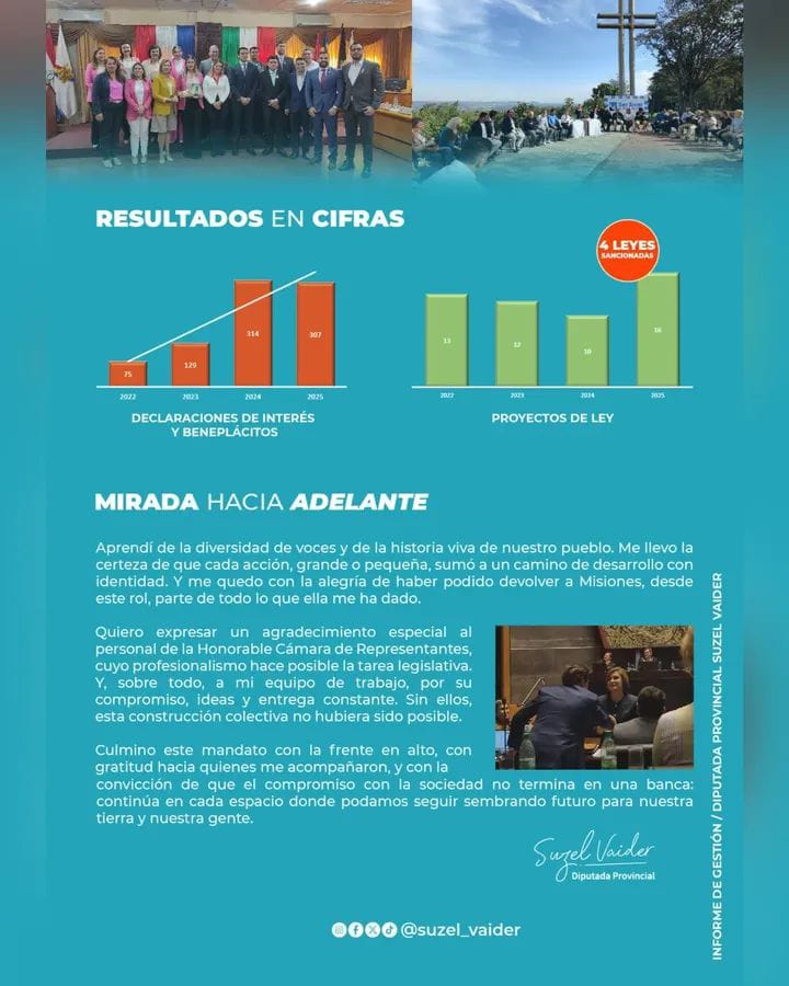 La diputada provincial Suzel Vaider presentó su Informe de Gestión Parlamentaria, que resume el trabajo legislativo realizado entre los años 2022 y 2025 en la Cámara de Representantes de Misiones, destacando una intensa labor orientada al desarrollo provincial, la inclusión social, la innovación, la economía misionera y la cultura local, con fuerte presencia territorial.